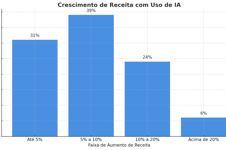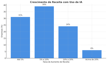 Outro estudo complementa: quase 70% das empresas que investiram em IA tiveram aumento de receita superior a 5%, e algumas superaram 20% de crescimento.